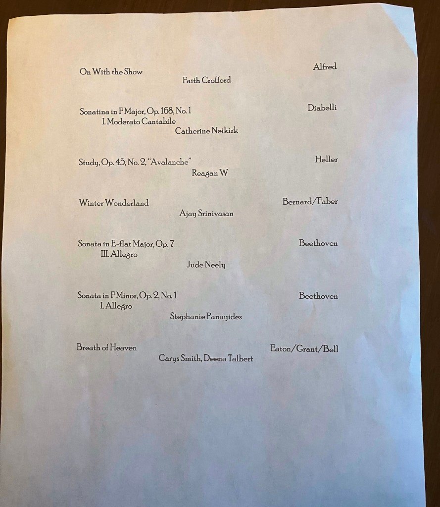 GroupProgram 1Program 2Hazel Hayden Gr. 2 (Shinn)Shiloh Cook Gr. 2 (Shinn)Tirzah Cook Gr. 7 (Shinn)Mariam Cisse Gr. 3 (Shinn)Amelie Gaygadzhiev-Ayala Gr. 5 (Shinn)Miranda Yu (Bethel)Adyson Osgood and Louise CarterAli Pool (Bethel)Karina Kulikovich (Ungar)Faith Crofford (Talbert)Catherine Neikirk (Ungar)Reagan W (Ungar)Ajay Srinivasan (Carter)Jude Neeley (Ungar)Stephanie Panayides (Ungar)Carys Smith & D. TalbertGroup