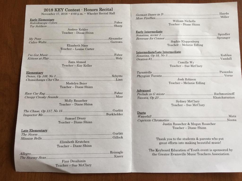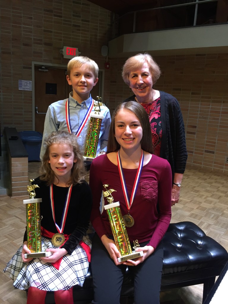 All Trophy Winners Early Elementary-Audrey Kehler (Shinn) Audrey & Bradley Kehler (Shinn) Madelyn Beier (Shinn) Elizabeth Krutchen (Shinn) Late Elementary-William Nicholls (Shinn) Elementary-Molly Rauscher (Shinn) Early Elementary-Audrey Kehler (Shinn), Elizabeth Nass (Carter), Zara Ahmed (Keller) Early Elementary-Elizabeth Nass (Carter) Elementary-Samuel Drury, Molly Rauscher, Madelyn Beier (Shinn) Late Elementary-William Nicholls, (Shinn), Elizabeth Krutchen (Shinn), Finn Drozhinin (McClary) Late Elementary-William Nicholls (Shinn), Elizabeth Krutchen (Shinn), Finn Drozhinin (McClary) Intermediate-Late Intermediate-Camille Wy (McClary), Josh Robison (Edling) Advanced-Sydney McClary (McClary) Duets-Megan & Justin Rauscher (Shinn) Trophy winners from Shinn Studio Trophy winners from Shinn Studio Molly, Megan & Justin Rauscher (Shinn) Molly, Megan, Justin Rauscher with teacher D. Shinn